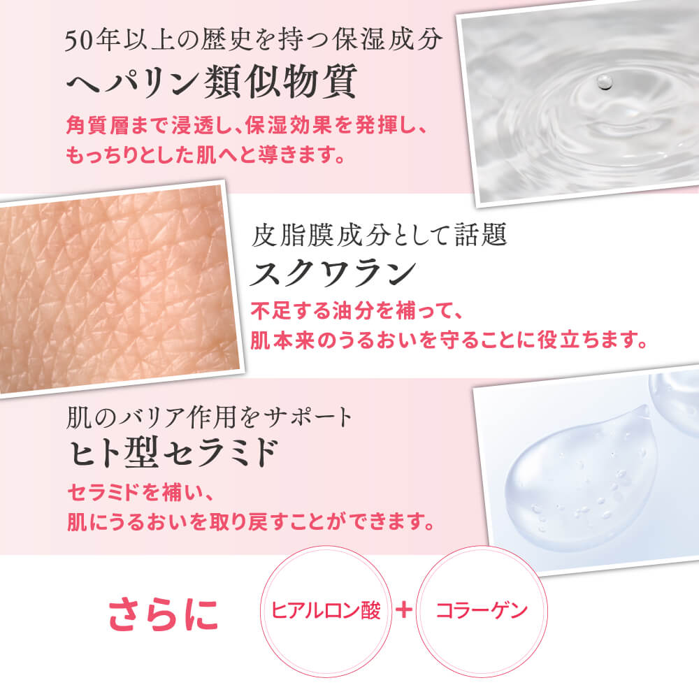 | 全成分 | グリチルリチン酸ジカリウム、ヘパリン類似物質、プラセンタエキス(1)、ヒアルロン酸ナトリウム(2)、水溶性コラーゲン液N、N-ステアロイルフィトスフィンゴシン、N-ステアロイルジヒドロスフィンゴシン、ヒドロキシステアリルフィトスフィンゴシン、フィトスフィンゴシン、スクワラン |